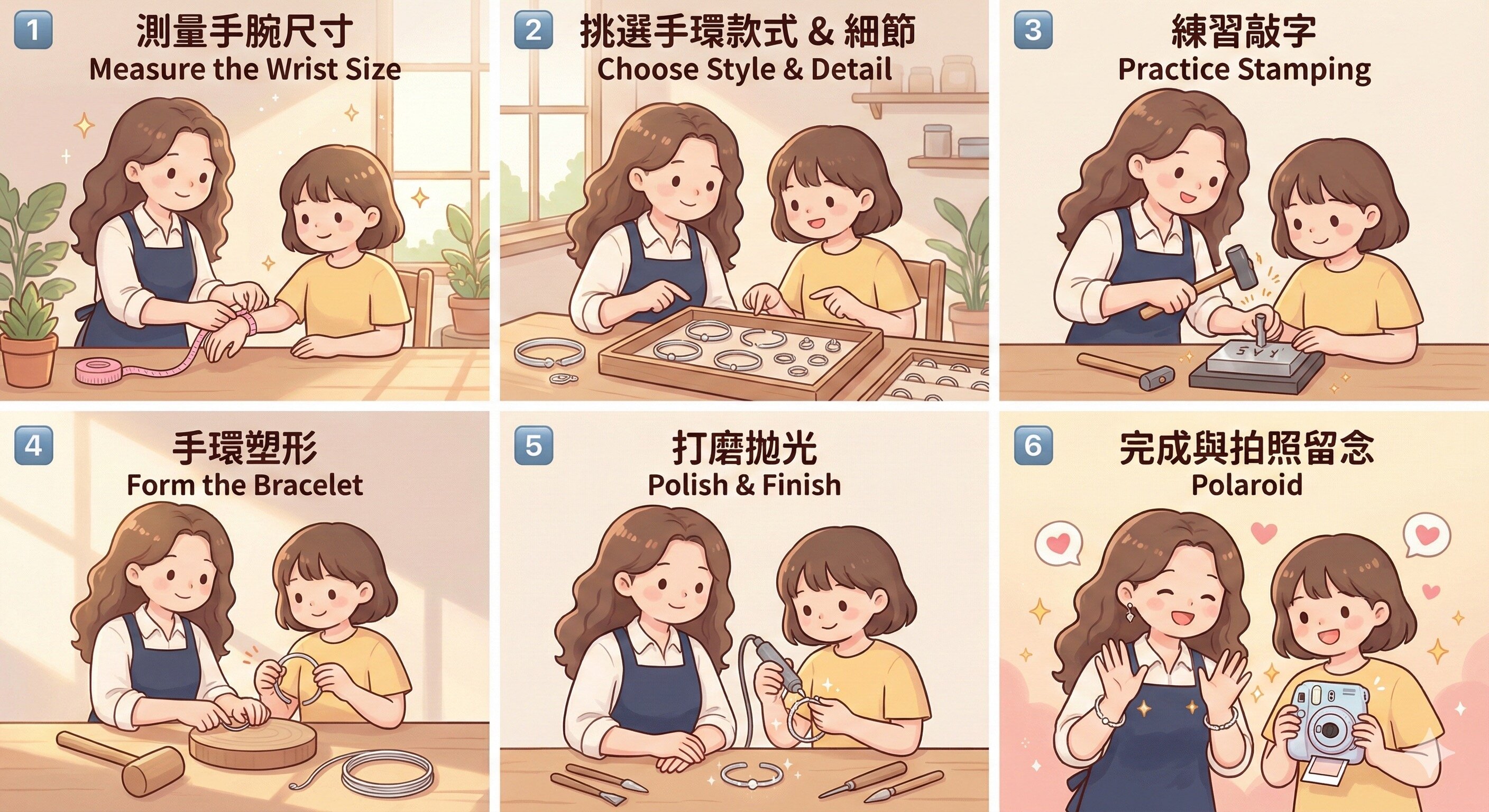 量度手圍➡️ 基本金工工具認識 ➡️ 退火➡️ 敲字 ➡️ 敲打成型 ➡️ 挫修 & 拋光